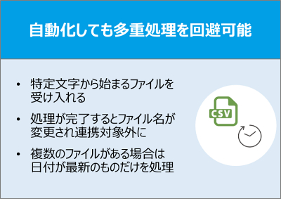指定フォルダー内の不要なファイルを受け入れない、一度受け入れたファイルが2重に処理されないようにする等、実務で求められるきめ細かな対応が可能です。