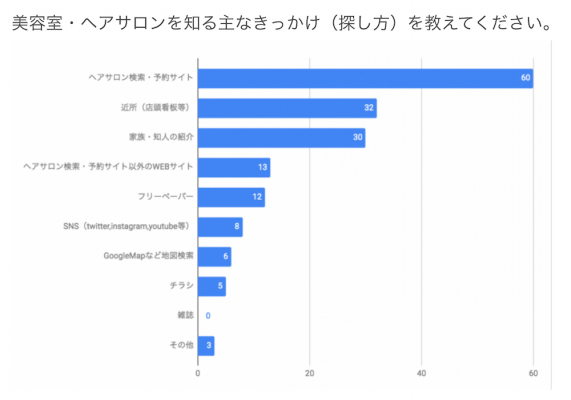 お客様が美容室を選ぶ決め手として最も多かったものが「家や職場から近い」となりましたが、条件は1つではなく、口コミの評価や、価格、お店のおしゃれさなど様々な要因を吟味して選んでいるので、その大半を比較して見ることができる「ヘアサロン検索・予約サイト」がやはり人気の探し方になっているようです。