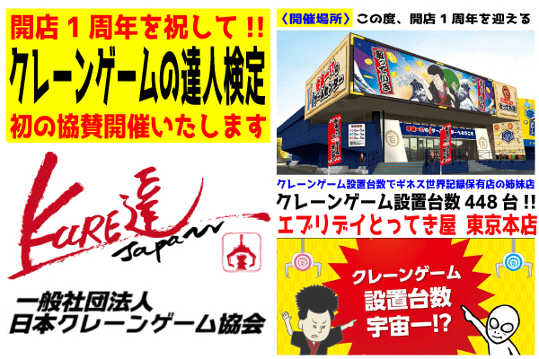 「クレーンゲームの達人検定(以下、くれ達検定)」という唯一のクレーンゲームの資格認定・発行をする一般社団法人 日本クレーンゲーム協会(代表理事 中村秀夫/埼玉県行田市)は、2020年7月11日(土)に、開店1周年イベントを行う、クレーンゲームの設置台数でギネス記録を保持するエブリデイ行田店の、自社でギネス記録を上回るクレーンゲーム設置台数で2019年7月13日にオープンした宇宙一のクレーンゲーム設置台数の姉妹店エブリデイとってき屋東京本店にて、開店1周年を祝して、クレーンゲームの達人検定を協賛開催させていただきます。