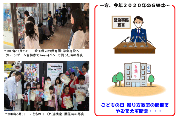 しかし、今年は、新型コロナウイルスの影響があり、こどもの日のあったゴールデンウィーク期間に、全国のゲームセンターやアミューズメント施設が営業自粛などせざるをえない状況に追い込まれ、今年のこどもの日は獲り方教室の開催を断念せざるをえませんでした。