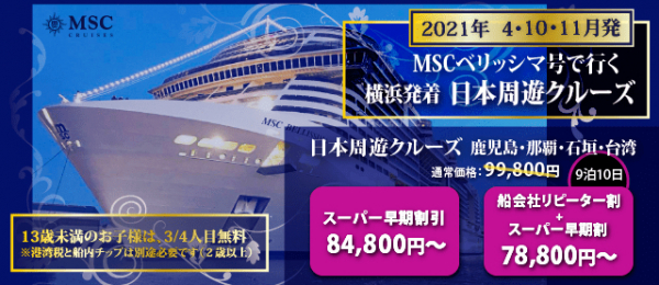 クルーズ予約サイト「ベストワンクルーズ」運営の株式会社ベストワンドットコム(本社:東京都新宿区、代表取締役:澤田秀太)は、2021年4月のMSCベリッシマ(横浜発着)3コースにてスーパー早期割料金を設定し、本日より販売開始いたしました。