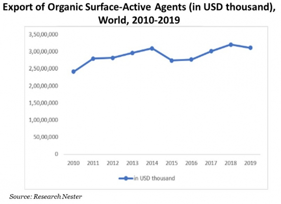 国際貿易センターの統計によると、消毒剤などの有機界面活性剤の輸出は、2010年の24,190,461千米ドルから2019年の31,150,804千に世界的に増加しました。https://www.researchnester.com/sample-request-2583