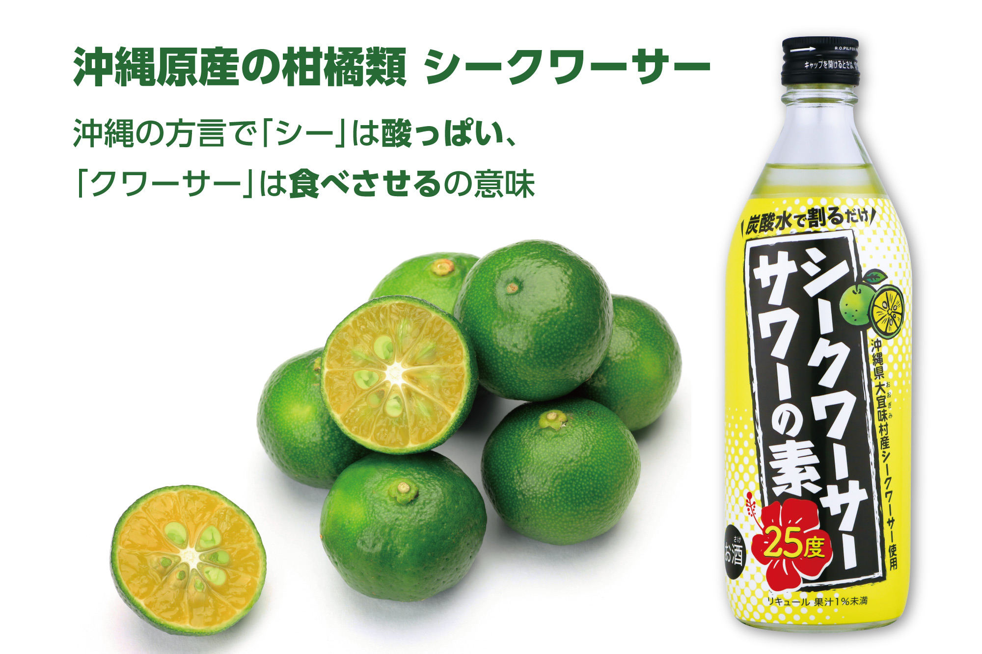 「シークワーサーサワーの素」は、グラスに氷を入れ、炭酸水で割るだけでシークワーサーサワーが完成する商品。沖縄で昔から親しまれている「シークワーサー割り」をおうちで手軽に楽しんでもらうために作られました。
