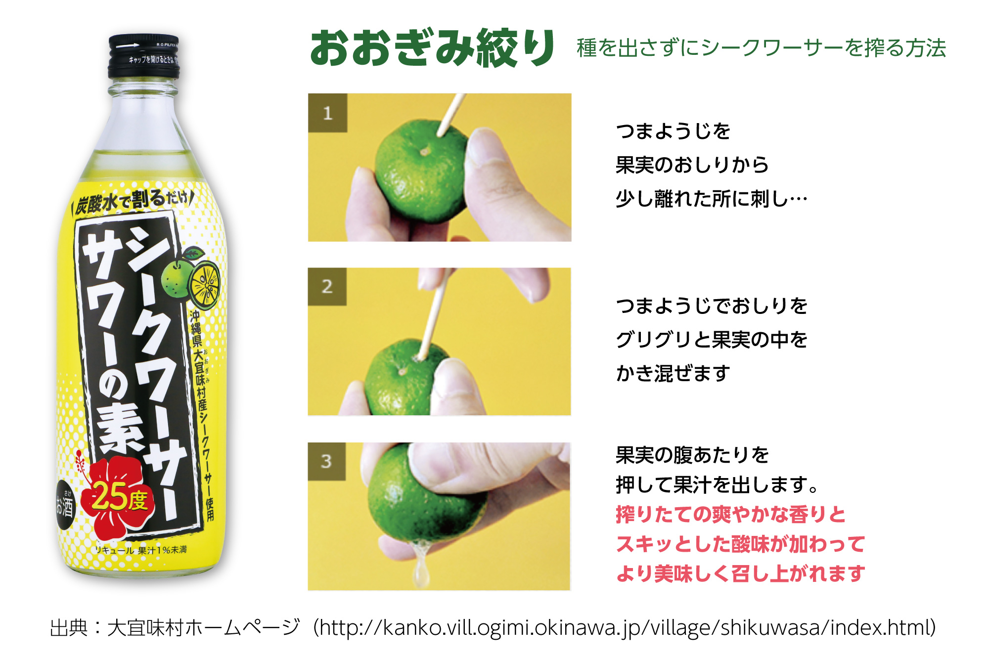 「おおぎみ絞り」とは、シークワーサーの一大産地 大宜味村で一般的な生シークワーサーの絞り方です。シークワーサーの下部分に爪楊枝をブスッと突き刺し、絞ることで果実が飛び散ることなく、果汁を絞り出すことができます。