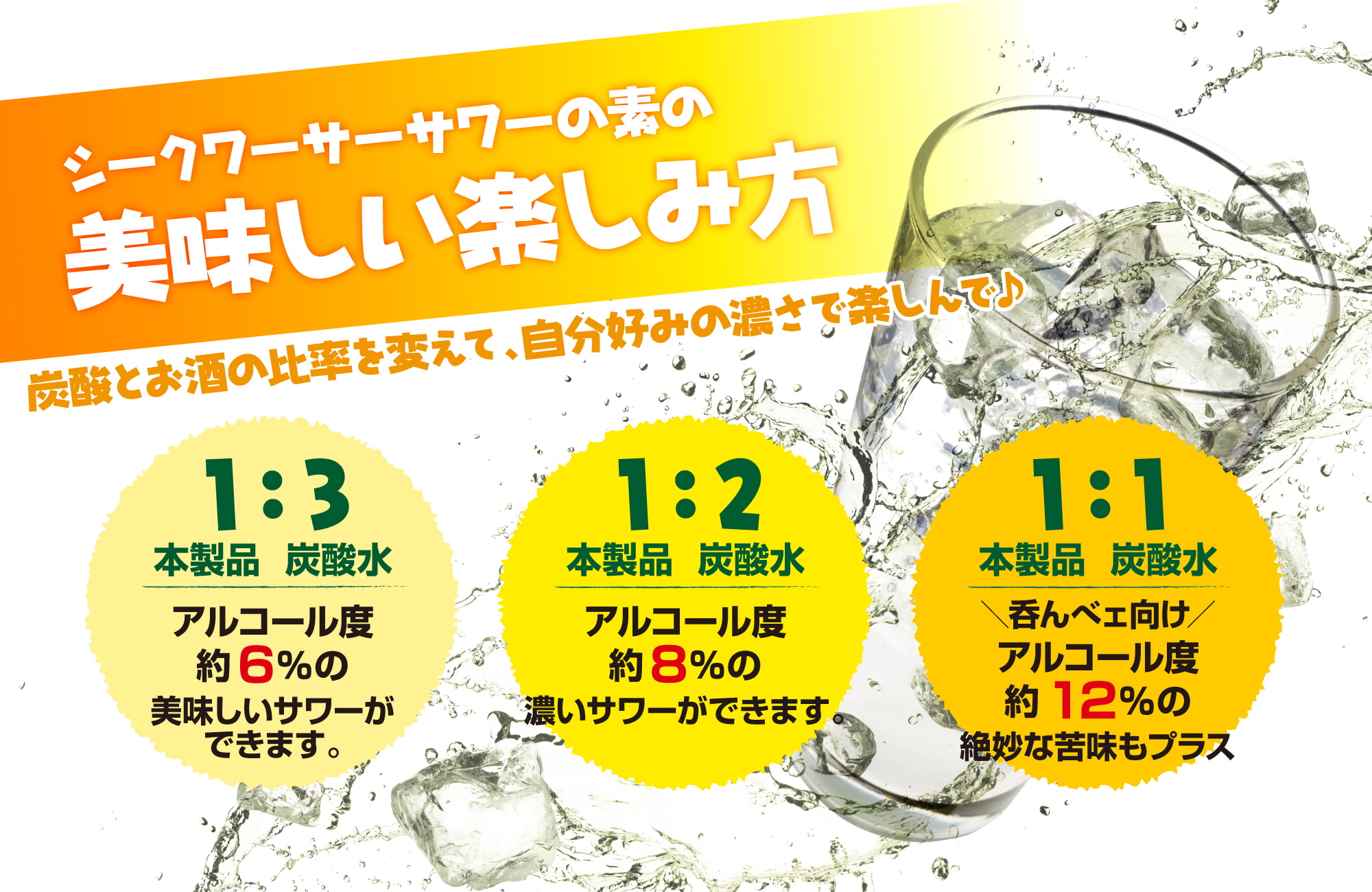 「シークワーサーサワーの素」は、炭酸とお酒の比率を変えることで、自分好みの濃さで楽しめるのも特徴の1つです。