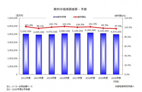 2020年度の飲料市場規模(牛乳・乳飲料を含む、メーカー出荷金額ベース)は、前年度比97.5%の4兆9,700億円と2年連続での縮小を予測する。本来であれば前年度の反動で再拡大してもおかしくないが、新型コロナウイルスの影響で4月、5月の販売が大幅に落ち込んでおり、今後も暫くは影響が残る見込みで、2020年度中の本格回復は難しいと考える。