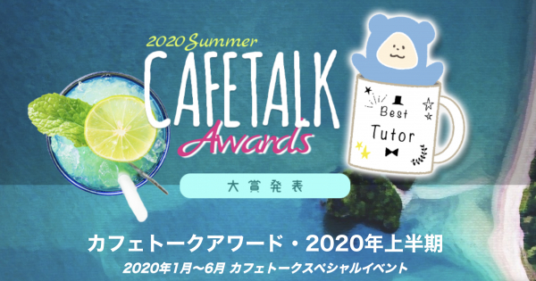 「カフェトークアワード・2020年上半期」では、2020年1月~6月に受講されたオンラインレッスンを対象とし、受講後に生徒様からご記入頂いた「口コミ」を元に、受講されたレッスン数などを加味し、個性溢れる各賞を決定致しました。