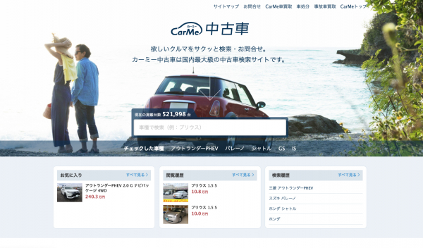 株式会社ファブリカコミュニケーションズが運営する自動車検索サイトで、中古車ポータルサイト「車選び.com」「カーセンサーnet」と連携し、全国52万1,000台以上の豊富な中古車情報からご希望の中古車を素早く検索・カンタンに無料問合せができる中古車検索サイトです。全国最大級の品揃えの中から選ぶことができ、複数車両を同時に検索できるライバル車検索を備えています。また、母体である新車・自動車ニュースのWEBマガジン「CarMe」による数多くの特集記事が読むこともできます。