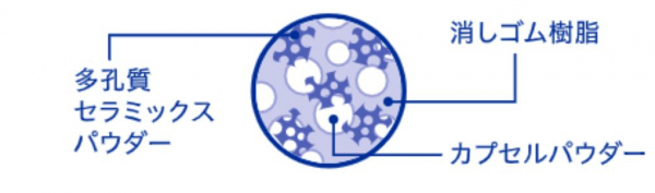 多孔質セラミックスパウダーとエアー入りカプセルパウダーをあわせた樹脂を採用。適度な硬さを持たせて折れにくく、より軽い“いつも角で消すような消し心地”を実現しています。