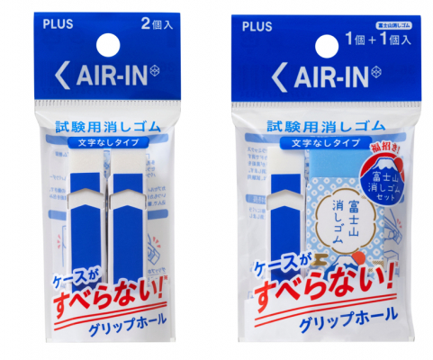 ラインアップは、試験中の“万が一”にも対応できる2個パックと、「ゲンを担ぎたい!」受験生の思いに応える、人気の「エアイン 富士山消しゴム」とのパック品の2種類です。メーカー希望小売価格(税抜)は試験用2個パックが120円、試験用&富士山消しゴムパックが260円です。