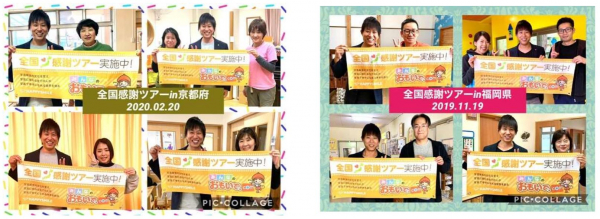 全国感謝ツアーとは、弊社サービス『みんなのおもいで . com』を導入の全国4,700以上の保育園・幼稚園さまに、日頃の感謝を直接お伝えするため毎月一週間かけてご訪問させていただくキャラバンです。