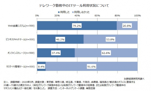 株式会社矢野経済研究所(代表取締役社長:水越孝)は、国内のテレワーク関連ソリューション市場を調査し、直近のITツール利用状況とテレワーク関連ソリューション市場動向、ポストコロナの働き方の変化を明らかにいたしました。ここでは、緊急事態宣言下のテレワークでのITツール利用状況、ならびにビデオ・Web会議システム市場動向について公表いたします。