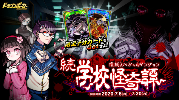 株式会社アソビズム(本社:東京都千代田区、代表取締役:大手智之)は、App Store・Google Playにて好評配信中のリアルタイム合体カードバトル『ドラゴンポーカー』で、2020年7月6日(月)より復刻スペシャルダンジョン「続・学校怪奇譚」を開催いたします。