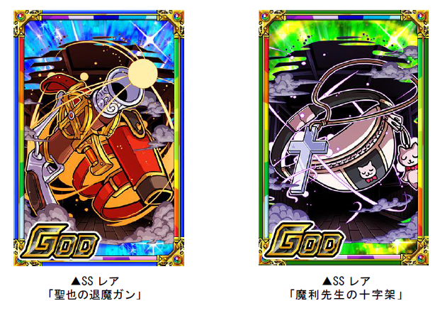 ダンジョンのボスモンスターを倒すと、まれに限定子分カード「聖也の退魔ガン」「魔利先生の十字架」が手に入ります。