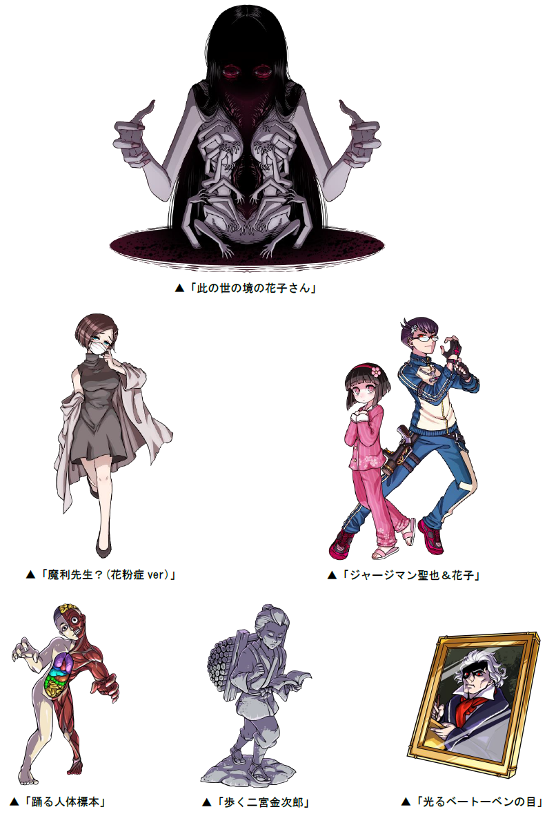 また、道中には「魔利先生?(花粉症ver)」「ジャージマン聖也&花子」などが出現し、クリアした際に手に入る「七不思議P」を貯めると、ポイントに応じてSS+レア「踊る人体標本」「歩く二宮金次郎」「光るベートーベンの目」などと交換することができます。