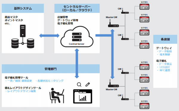「電子棚札ソリューション」は、既存の値札を電子棚札に置き換えることで、価格変更の一括制御や価格を変動させるダイナミックプライシングを実現し、効率的かつ機動的な新しい店舗作りをサポートするデジタルソリューションです。
