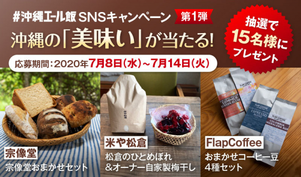 沖縄発のインターネットベンチャーである琉球インタラクティブ株式会社(本社:沖縄県宜野湾市、代表取締役社長:臼井 隆秀、以下「琉球インタラクティブ」)は、沖縄県民による飲食店応援プロジェクト「沖縄エール飯」で、公式SNSアカウントをフォローしてコメントすると投稿者の中から抽選で各回15名様・計45名様に沖縄の有名飲食店からのオリジナル賞品が当たる“沖縄の「美味い」が当たる!SNSキャンペーン”を2020年7月8日(水)から開催します。