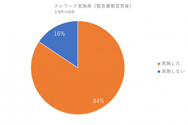 緊急事態宣言後のテレワークについては、有効回答数578のうち84%がテレワークを実施したと回答し、業務都合によりテレワークを実施しなかった従業員は16%でした。