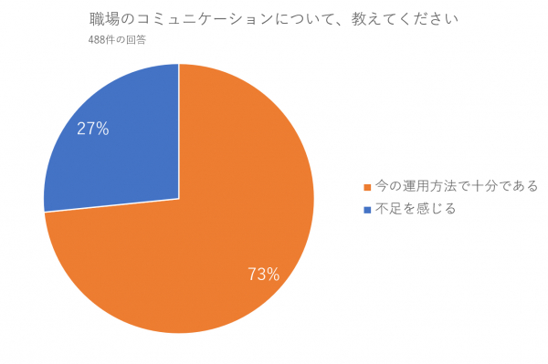 「職場のコミュニケーション」については、73%が「今の運用方法で十分である」と答え、おおむね良好な評価でした。不足を感じるという声としては、特に教育に関する部分で不足を感じる意見が見受けられました。これは対面での表情や温度感で相手の理解度を計っているためと考えられるので、上記でも挙げたように、ビデオ通話ツールなどの活用により改善を図っています。