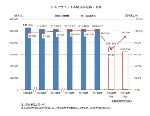 2020年度の国内リネンサプライ市場規模(事業者売上高ベース)は、前年度比69.1%の3,582億41百万円まで落ち込み、非常に厳しい状況になると予測する。特に、これまで市場を牽引してきたホテルリネン、フィットネスクラブやエステサロン向けのサービスリネンの需要は半減するとともに、レストランや飲食店向けのフードリネン、鉄道や航空機、船舶向けの交通リネンもそれに近い落ち込みになると予測する。