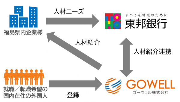 外国人人材紹介事業、通訳翻訳事業等、アジアに特化した各種サービスを提供するゴーウェル株式会社(本社:東京都中央区、代表取締役社長:松田 秀和、以下「当社」という。)は、株式会社東邦銀行(本店:福島県福島市、頭取:佐藤 稔、以下「東邦銀行」という。)と2020年7月9日に外国人人材紹介事業における業務提携契約を締結しましたので、お知らせします。