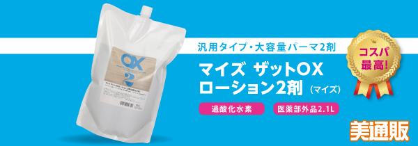 今回ピックアップした「マイズザットOXローション」は、ほとんどのチオコールドパマー1剤に対応可能な汎用タイプのパーマ2剤。「美通販」でも、「医薬部外品パーマ大容量2剤部門」において売上ランキングNo.1の実績をもつ人気商品です。