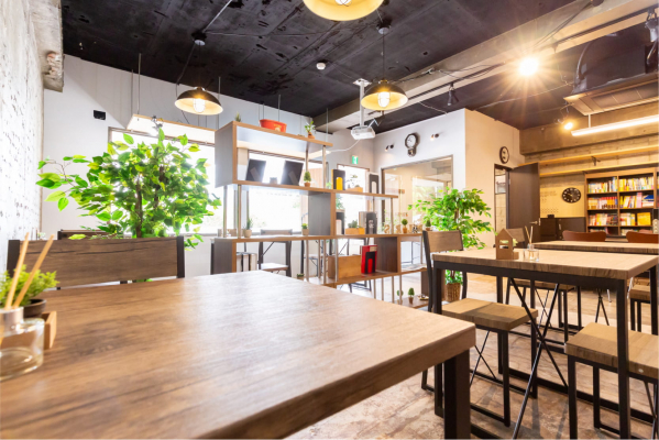 レンガ調の壁面に、緑と独自のアート作品があふれる内装。小さなボリュームでの静かなカフェBGM、集中力を高めるアロマの薄い香りなども取り入れています。