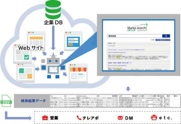 Google 等検索エンジンを使った企業情報の検索 ・ 収集は今や当たり前のように行われています。 しかし検索エンジンの結果一覧には、 広告やブログ等目的外の情報も混在し、 欲しいサイトをなかなか見つけられないことも多いかと思います。そして見つけた目的の企業リンクから企業サイトに、 さらに会社情報ページを探し、 住所や電話番号をコピー&ペーストする、 Web情報収集においてはこういったとても面倒な作業をこれまで伴っていました。