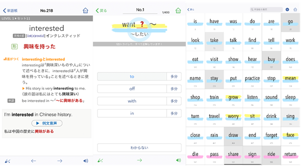 英単熟語を確実に覚えるためには、反復学習が大切です。本アプリでは次の3ステップで学習することができるので、ステップごとに繰り返し英単熟語を確認し、記憶を定着させましょう。