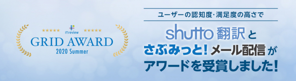 株式会社イー・エージェンシー(本社:東京都千代田区、代表取締役:甲斐真樹)が提供するWebサイト翻訳サービス「shutto翻訳(しゅっと ほんやく)」ならびにメール配信システム「さぶみっと!メール配信」は、アイティクラウド社主催の「ITreview Grid Award 2020 Summer」(※2020年7月15日発表)において、ユーザーから高い評価を受け、それぞれの部門でアワードを受賞しました。
