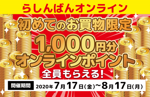 キャンペーン期間中、らしんばんオンラインにて初めてお買物をする際、5,000円以上(送料別)ご購入いただくと、次回のお買物などで使える1,000円分のオンラインポイントをプレゼントします。