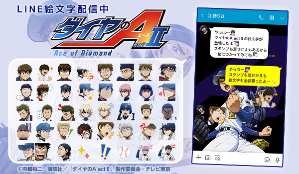 株式会社インクルーズ(東京都渋谷区、代表取締役社長 山﨑 健司)は、LINE株式会社(東京都新宿区、代表取締役社長 出澤 剛)が運営するコミュニケーションアプリ「LINE」内のショップにて、2020年6月25日(木)に初登場したLINEスタンプに続き、こちらも初登場となるTVアニメ「ダイヤのA actII」LINE絵文字を配信開始しました!また、今回はLINE絵文字と同時に、TVアニメ「ダイヤのA actII」LINE着せかえ7種類も配信し、計8点を2020年7月17日(金)に一斉に配信を開始致しました。