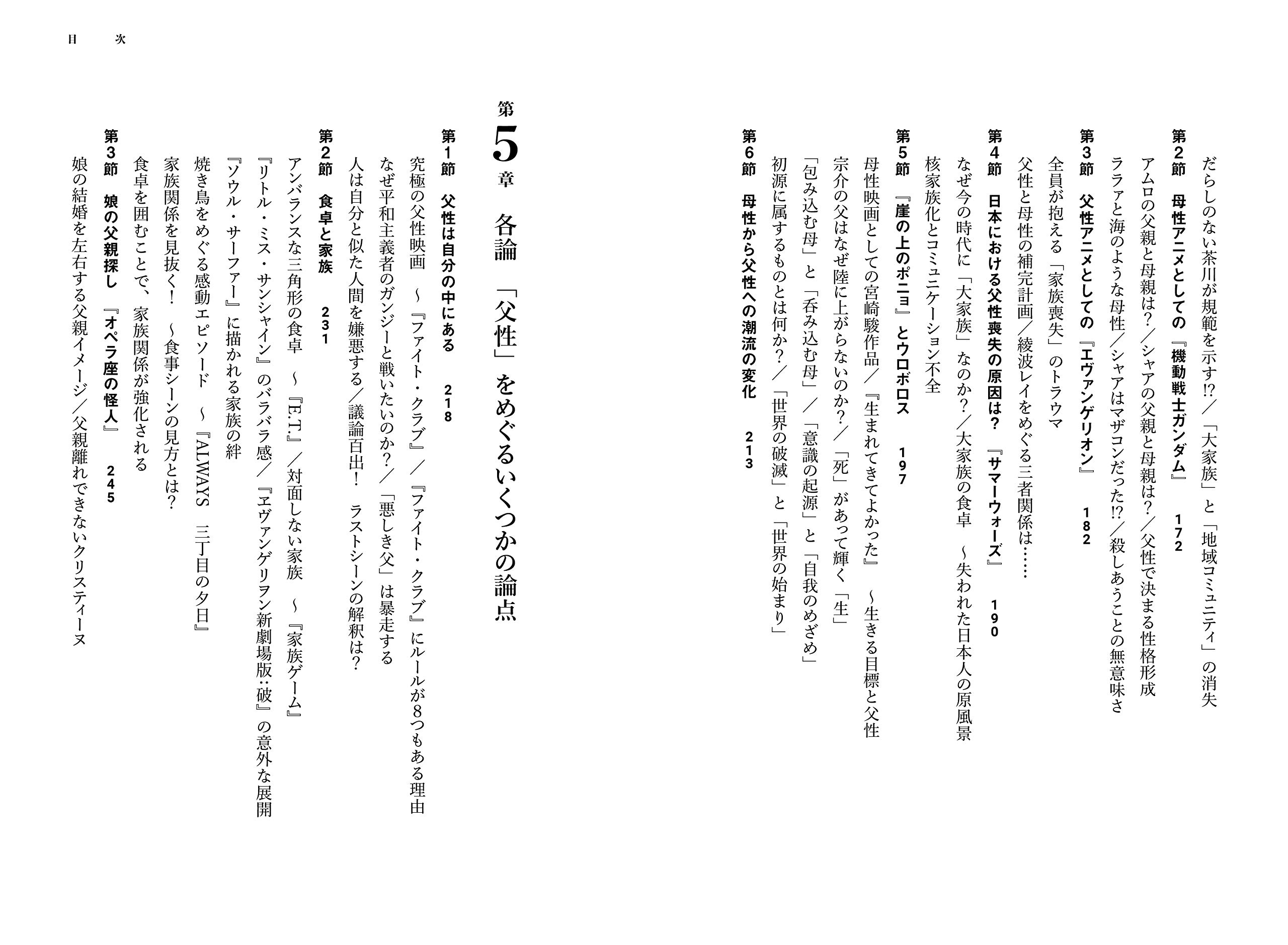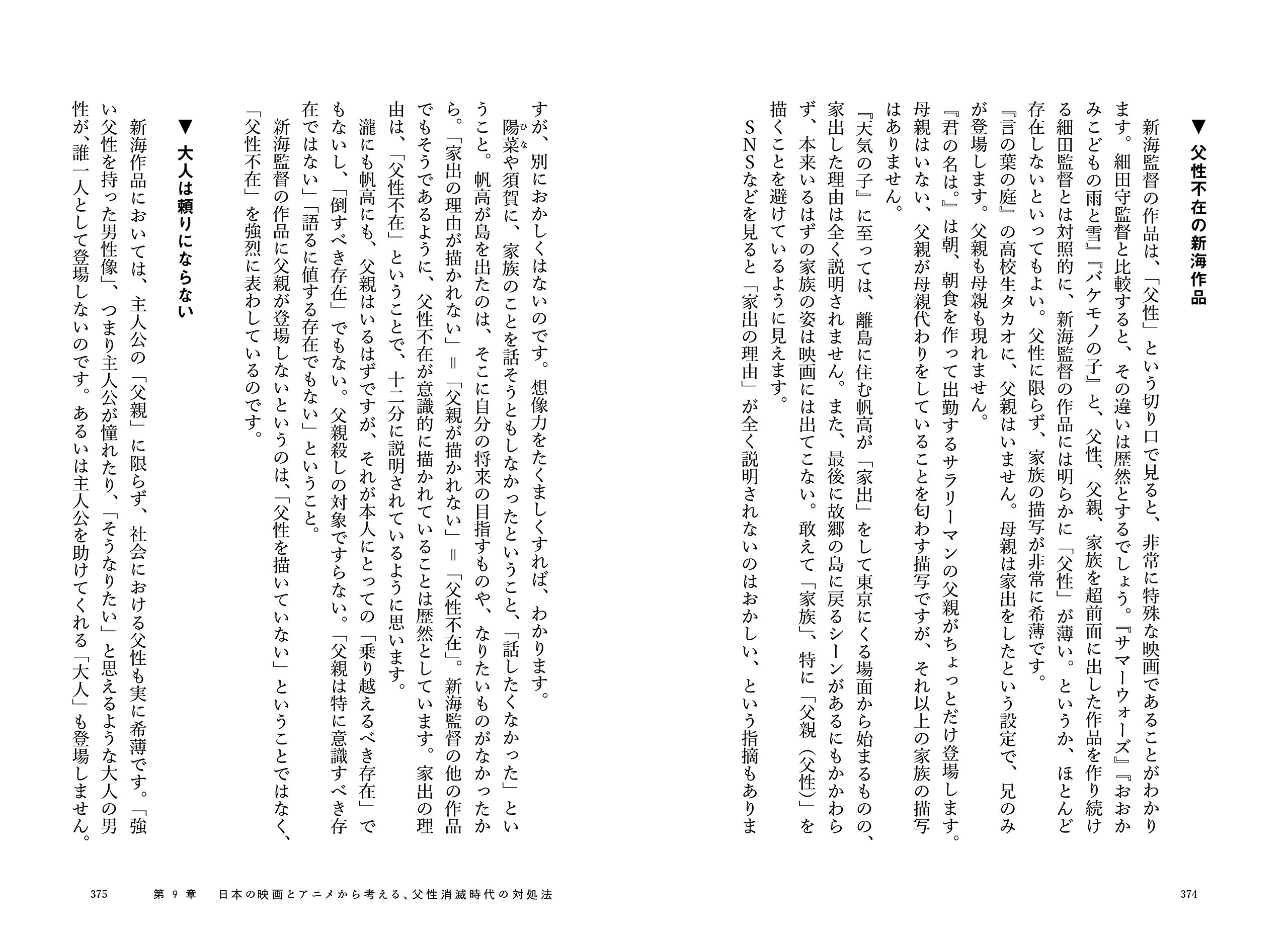 アニメ・映画における父親像の変遷と消滅への道を分析しながら、現代における「父親探し」「父性回復」を分析。