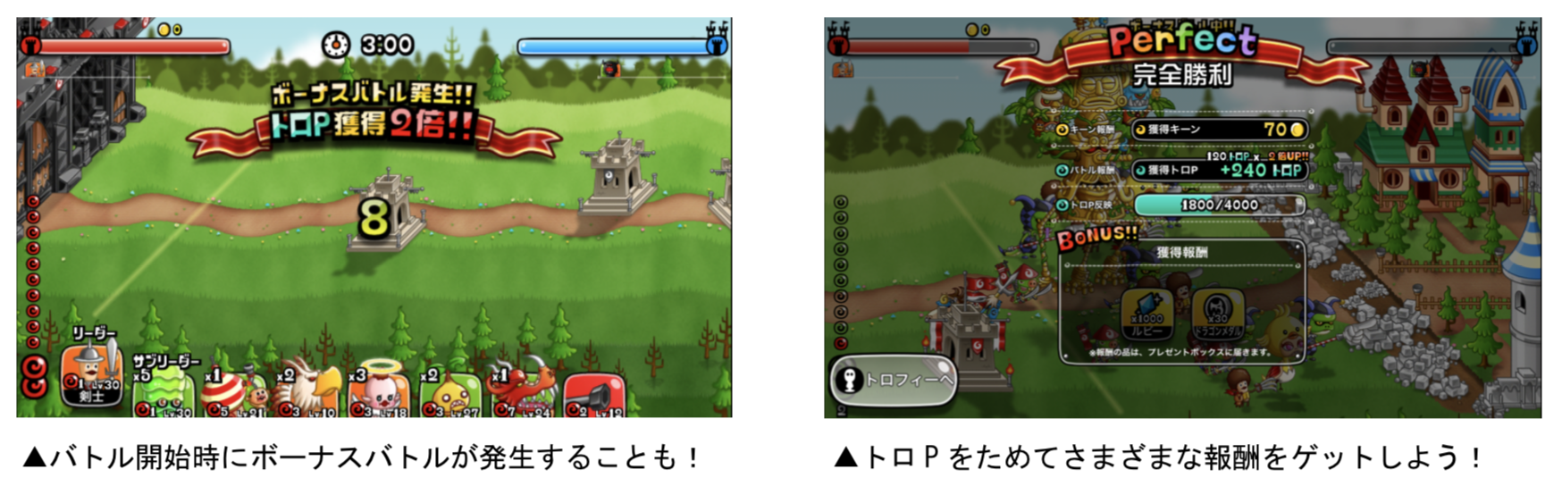 トロフィーバトルは、出場条件を満たしたキャラをリーダーにして戦い、“トロP”を獲得することが目的のバトルです。一定数のポイントがたまると、さまざまな報酬のほか、キャラの能力値が上昇する“D1武具”などが入手できます。