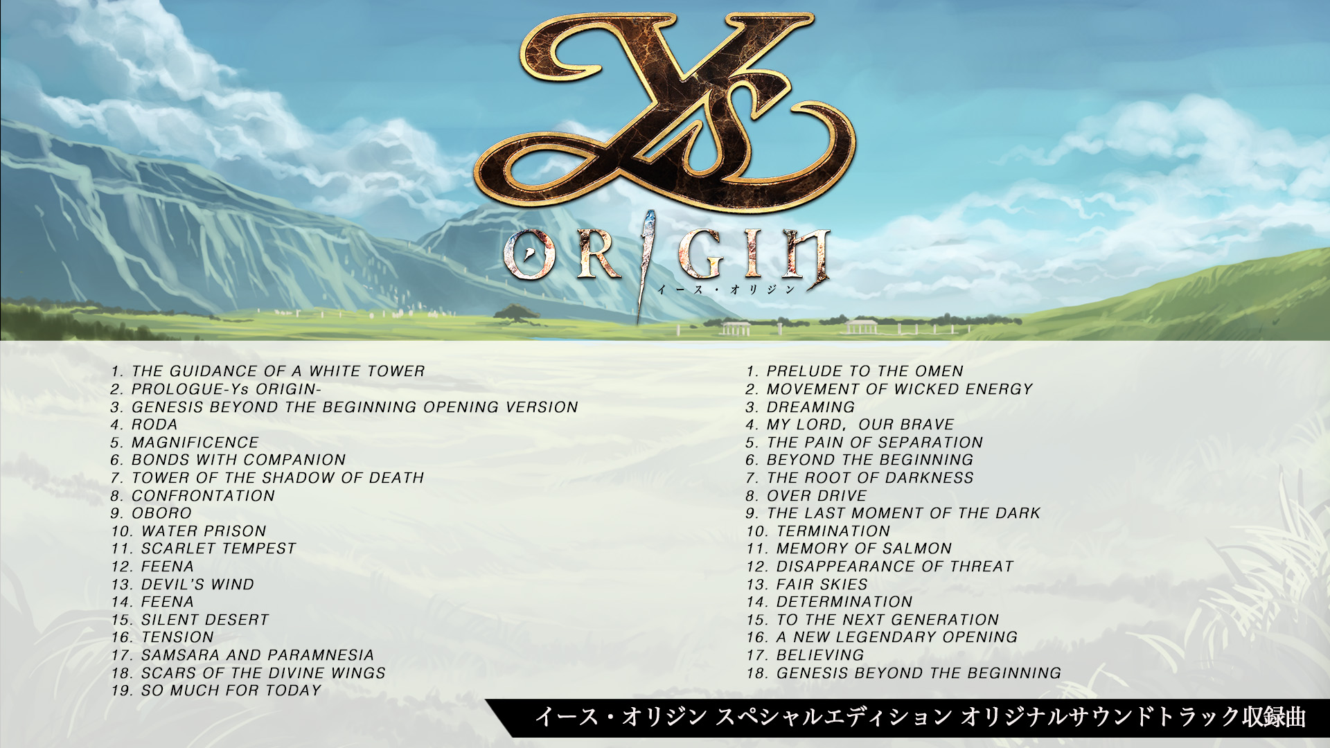 ゲームのオープニングを飾る『GENESIS BEYOND THE BEGINNING』をはじめとする楽曲の数々が集結したオリジナルサウンドトラック。静けさと力強さが混在した楽曲から、キャラクターをフィーチャーした楽曲、ボス戦、フィールド曲など、『イース・オリジン』に内在する世界観がドラマチックに展開する全37曲が2枚組CDとして同梱されます。