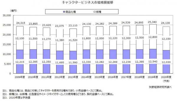 2020年度のキャラクタービジネス市場(商品化権、版権)は新型コロナウイルスの影響により、キャラクターショップやテーマパークなど店頭におけるキャラクターグッズの販売減少に加え、これまで市場を牽引してきたインバウンド(訪日外国人客)需要の縮小、広告宣伝費の削減等により、前年度比95.2%の2兆4,130億円になると予測する。