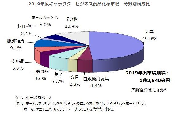 2019年度のキャラクタービジネス市場規模(商品化権、版権)は前年度比101.8%の2兆5,340億円と成長した。令和最初のメガヒット作ともいわれる「鬼滅の刃」を中心に、アニメ化されたキャラクターが好調に推移した。