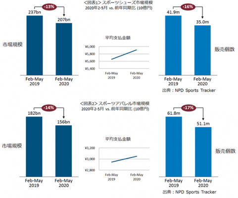 2020年2-5月において市場規模は大幅に縮小(スポーツシューズ:-13%、アパレル:-14%)