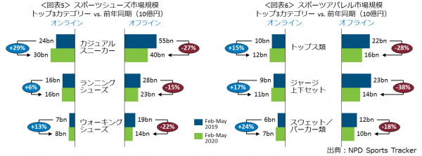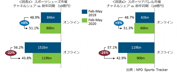 オフライン大幅減もオンライン市場成長(スポーツシューズ:+4%、アパレル:+5%)