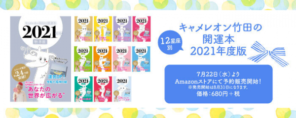 ゴマブックス株式会社(所在地:東京都港区、代表取締役社長:赤井仁)は、2020年7月22日(水)からAmazonストアにて『キャメレオン竹田の開運本 2021年版』(キャメレオン竹田=著)の予約販売を開始いたしました。