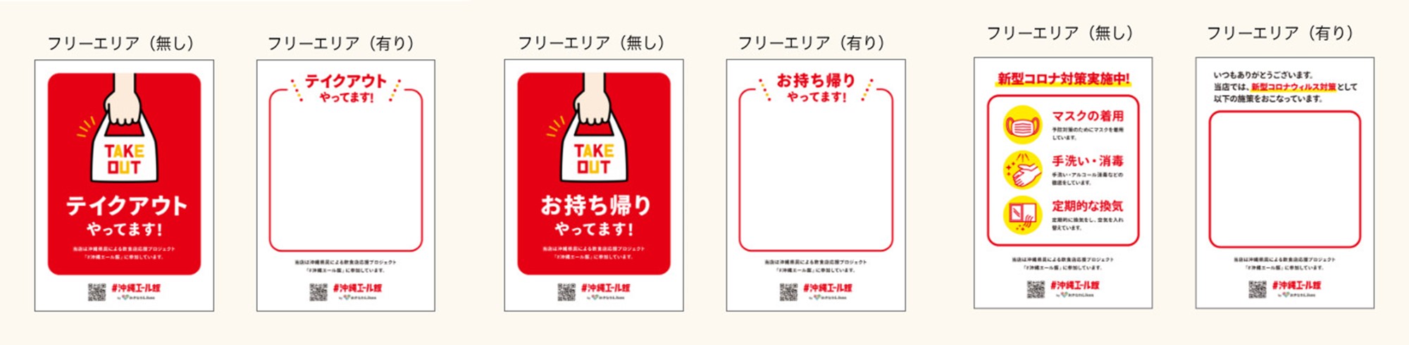 そしてこの度、県内の飲食店を支援する新たな施策として、「新型コロナ対策」と「テイクアウト」の告知に使用できる“のぼり・ポスター”データの無料配布を開始しました。無料配布に期間は設けていないため、状況に応じて必要なタイミングでダウンロードいただき、ご自由にお使いください。その他、沖縄エール飯では新たなコンテンツとして、飲食店における適切な感染防止対策や国や県から発表されている支援制度について纏めた「飲食店向けお役立ち情報」も公開しています。