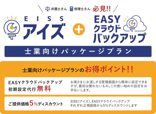 そんなもしもの時の大きな助けとなる「EISS(アイズ)」と「EASYクラウドバックアップ」の両製品を弁護士や税理士などの士業の方々に特におすすめしたいパッケージプランとして展開させていただきますが、両製品ともにクラウド型サービスとして提供しており、機器をご用意いただく必要がなく、すぐに導入いただくことが可能。メンテナンス等は当社で随時行うので運用の負荷を少なく抑えることができます。