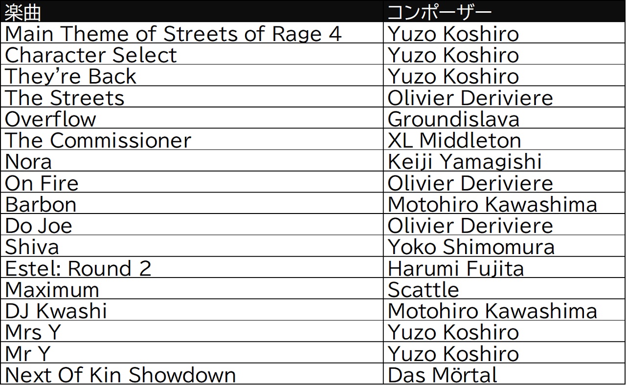 1991年の誕生以来、『ベア・ナックル』シリーズを手掛けてきたゲーム音楽のカリスマ・古代祐三氏、比類なき作曲家・川島基宏氏に加えて、ワールドクラスの豪華なコンポーザー陣がオールスターアンサンブルとして加わります。