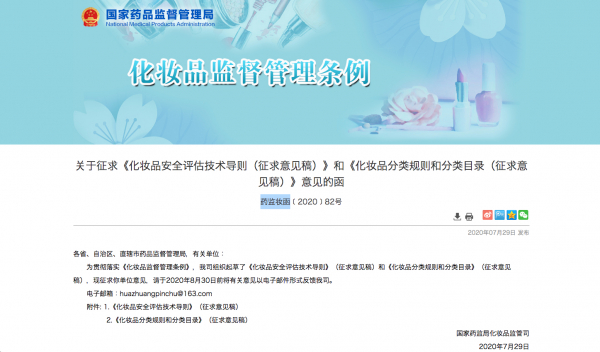 中国国家薬品監督管理局は7月29日夜、新化粧品監督管理条例の実施細則の一部にあたると思われる「化粧品安全性評価のための技術ガイドライン」および「化粧品分類規則」に関する意見募集稿(薬監粧簡[2020] 82号)」を発表しました。