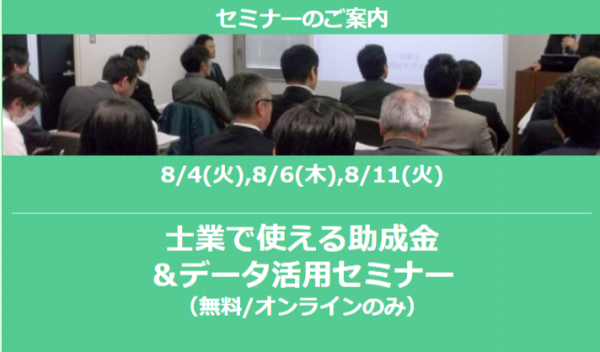 そこで今回「士業で使える助成金&データ活用セミナー」を8/4(火),8/6(木),8/11(火)に開催します。