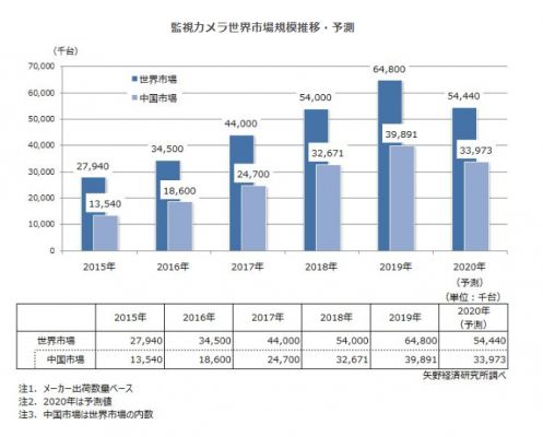 2019年の監視カメラの世界市場規模は、メーカー出荷数量ベースで64,800千台(前年比120.0%)となった。全体の6割を占める中国市場は前年比122.1%と成長して世界市場を牽引したほか、その他エリア(中東、中南米、アフリカ、ロシア)の出荷台数が拡大し、世界市場の成長につながった。
