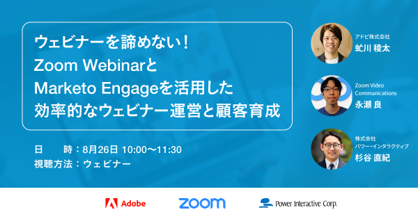 株式会社パワー・インタラクティブは、ウェビナーをきっかけにデジタルマーケティング強化を進めたい方を対象に、Zoom社、アドビ社との共催無料ウェビナー『ウェビナーを諦めない!ZoomウェビナーとMarketo Engageを活用した効率的なウェビナー運営と顧客育成』(参加無料)を、8月26日に開催します。