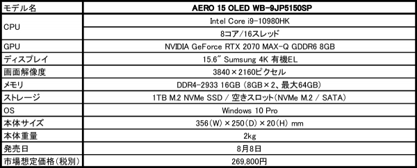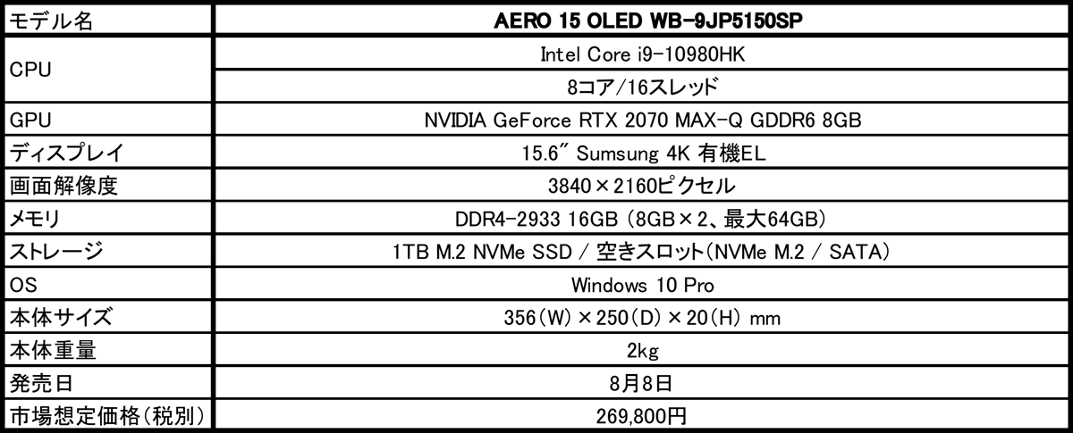AERO 15 OLED WB-9JP5150SPは、CPUに8コア/16スレッドのIntel Core i9-10980HKを搭載し、GPUにNVIDIA GeForce RTX 2070 with Max-Q 8GBを組み合わせています。また、メモリはDDR4-2933 16GB(8GB×2、最大64GBまで増設可能)、ストレージは1TBのM.2 NVMe SSDを装備しています。
