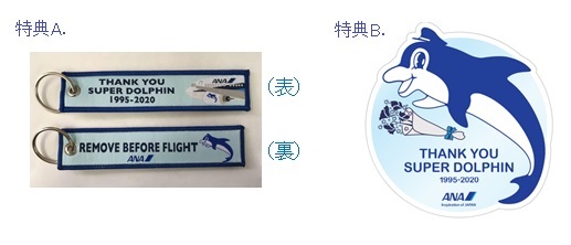 B. 『ANA 737-500スーパードルフィン退役記念カレンダー』の壁掛けタイプ((1))、卓上タイプ((2))の単品をそれぞれご予約いただいた方には、「スーパードルフィンオリジナルステッカー」を単品につき1枚プレゼント (画像右)