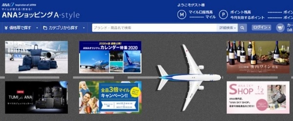 ANA STORE/ANAショッピングA-styleはANAオリジナル開発商品や旅をテーマに日本だけでなく世界中の商品を取り扱うANA公式のショッピングサイト。ANAマイレージクラブ会員の方は、貯めたマイルを使って1マイル=1円としてお買い物にお使いいただけるとともに、現金やクレジットカードでのお支払い分に対してANAのマイルが貯まるサービスも行っています。